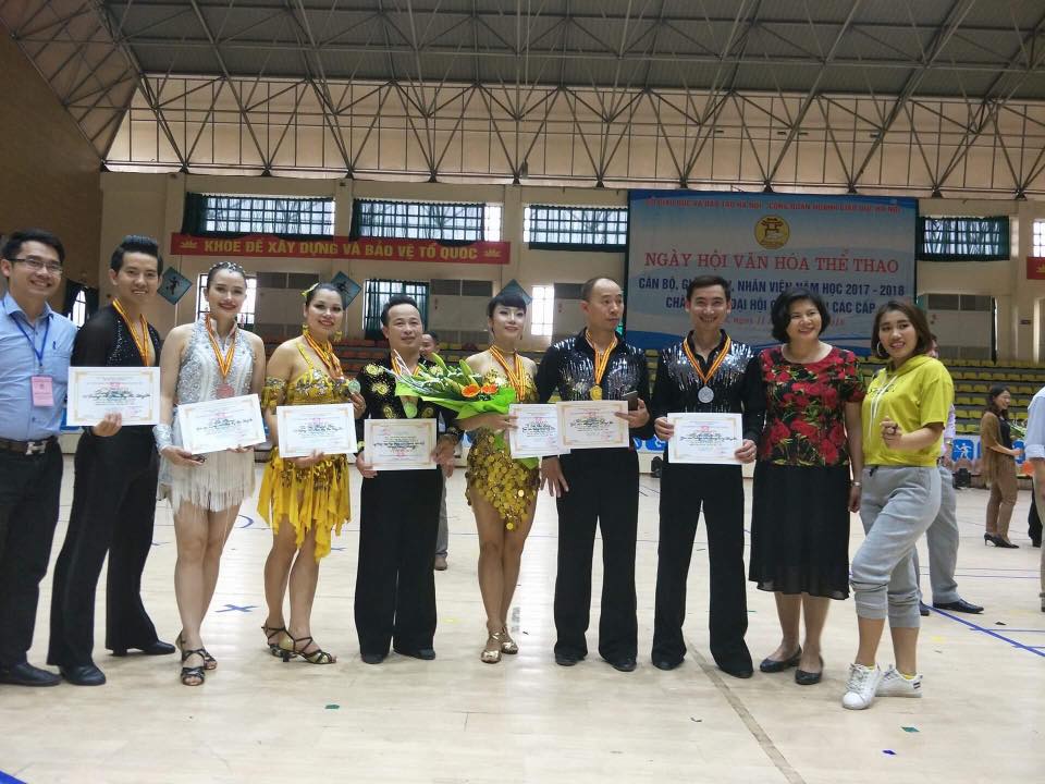 Thầy giáo Hà Văn Thọ – Chủ tịch Công đoàn nhà trường (đầu tiên từ trái sang) đã có mặt cổ vũ, chúc mừng và chụp ảnh lưu niệm cũng các cặp đôi “vũ công” được vinh danh trong Hội thi khiêu vũ toàn ngành Giáo dục và Đào tạo ở Hà Nội. Thầy giáo Dương Thế Hiển (môn Vật Lý) và cô giáo Lê Thị Phương (môn Ngữ Văn) đã được trao Giải Ba (thứ hai và ba từ trái sang) với điểm số thuyết phục.
