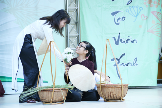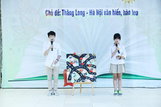 Thêm nhân lên tình yêu với Thăng Long – Hà Nội, toàn trường đã được chứng kiến những tà áo dài thanh lịch trên nền một ca khúc đặc sắc về Người Hà Nội của nhạc sĩ Duy Quang. Đó là bài hát “Hoa Tràng An” với ước nguyện: “ Là nét hào hoa không bao giờ nhạt phai”. Mở đầu chương trình là tiết mục thời trang đặc sắc với sự xuất hiện của các thầy cô giáo chủ nhiệm và học sinh các lớp 12 tham gia chương trình hôm nay. Trong đó có 4 bộ áo dài trắng được vẽ và thiết kế họa tiết về Thủ đô Hà Nội. Đó là sản phẩm được tạo tác từ những bàn tay khéo léo, tài hoa của các bạn HS đến từ lớp 12 D2: Hải Hà, Ngọc Thảo và Anh Nhân.