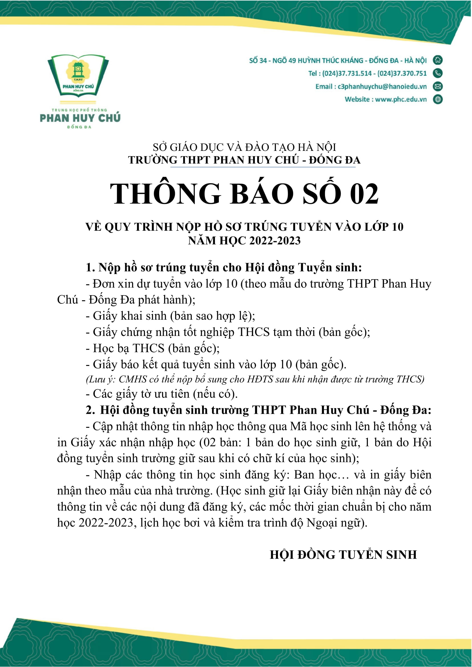 Tuyển sinhĐIỂM CHUẨN ĐỢT 1 TUYỂN SINH VÀO LỚP 10 NĂM HỌC 2022-2023 Đã đăng trên 09/07/202205/08/2025 bởi admin admin NHỮNG TÌNH CẢM QUÝ YÊU ĐƯỢC GỬI ĐẾN THẦY HÀ XUÂN NHÂM – NGUYÊN HIỆU TRƯỞNG NHÀ TRƯỜNG THÔNG BÁO TẠM DỪNG TUYỂN SINH BẰNG PHƯƠNG THỨC XÉT TUYỂN ĐIỂM THI VÀO LỚP 10 NĂM HỌC 2022-2023