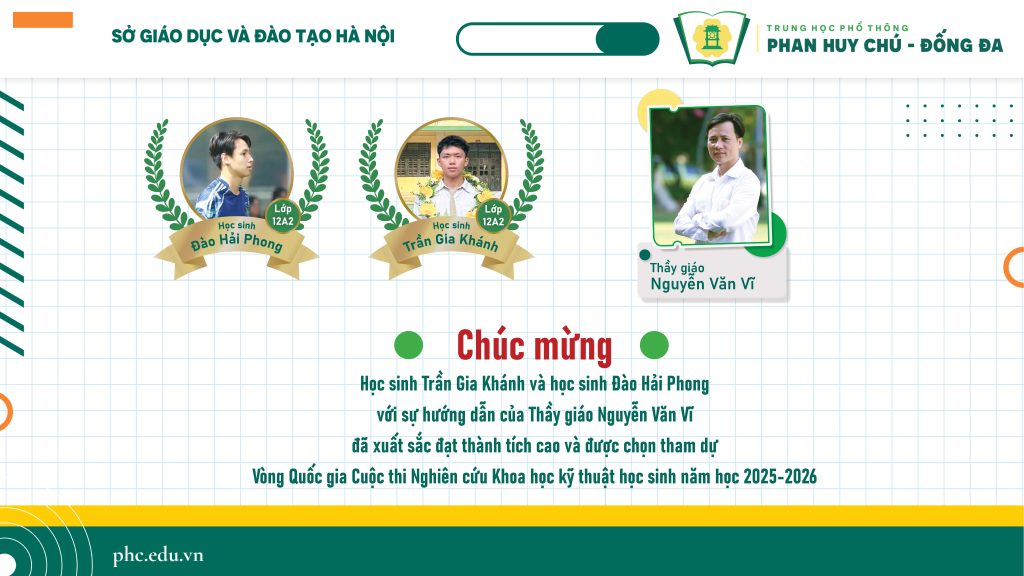 Cùng trong niềm phấn khởi đầu năm, toàn trường đã chúc mừng hai học sinh lớp 12A2 là Trần Gia Khánh và học sinh Đào Hải Phong, với sự hướng dẫn của thầy giáo Nguyễn Văn Vĩ, đã xuất sắc đạt thành tích cao và được chọn tham dự Vòng Quốc gia Cuộc thi Nghiên cứu khoa học kỹ thuật học sinh năm học 2025–2026.