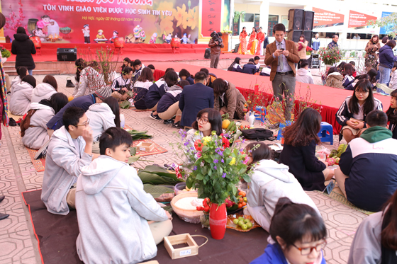 Học sinh các lớp thi gói bánh chưng và bày mâm ngũ quả