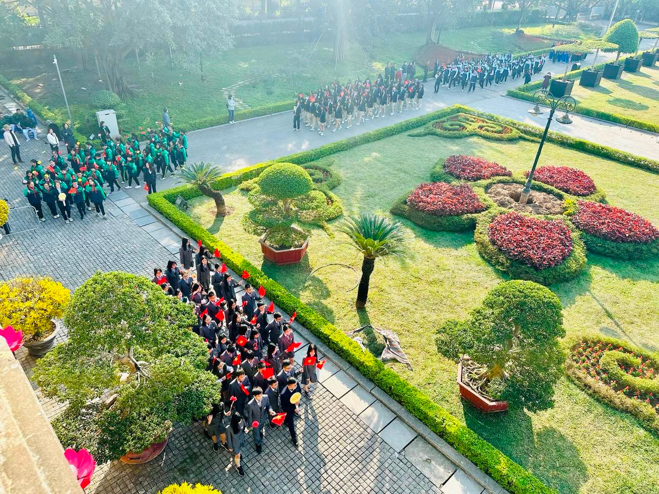 Lễ chào cờ diễn ra trang trọng, các đoàn đại biểu và học sinh diễu qua qua quảng trường và tập kết trước sân Đoan Môn để làm lễ chào cờ.