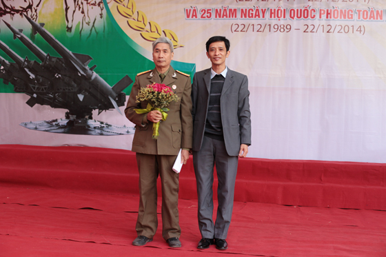 Thầy giáo Phó hiệu trưởng Hà Xuân Nhâm tặng hoa cho thượng tá  Vũ Văn Tân
