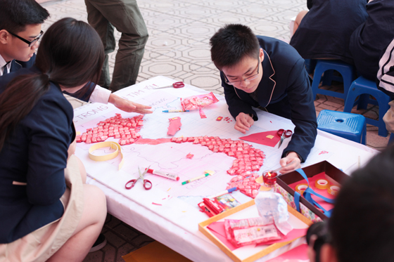 Lớp 11C với  tác phẩm dự thi đạt giải Nhất. Các bạn tạo hình và sắp đặt bản đồ Tổ quốc bằng kẹo màu hồng