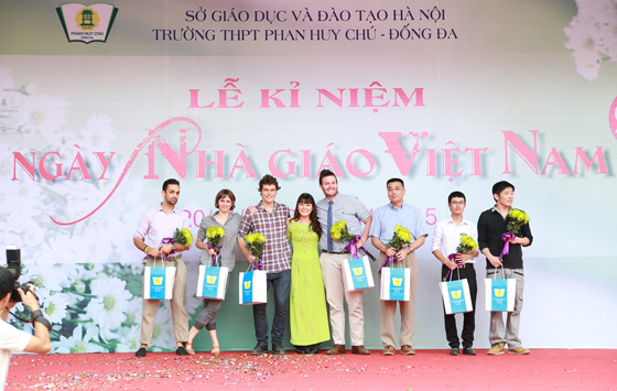 Lãnh đạo nhà trường tặng hoa và quà cho các thầy cô giáo người nước ngoài dạy tiếng Anh và tiếng Nhật trong trường. Khách tham dự đều thấy rõ đây là ngôi trường của hội nhập và tiến bộ.