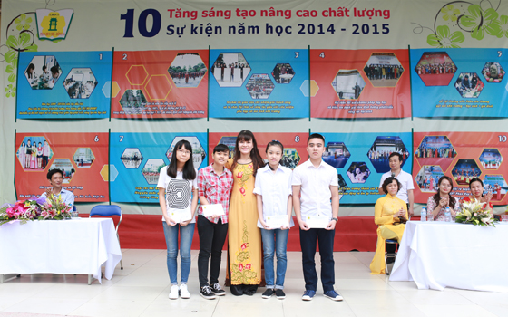Cô Hiệu trưởng Nguyễn Thị Nhiếp cùng các học sinh được nhận học bổng năm học 2015 – 2016.