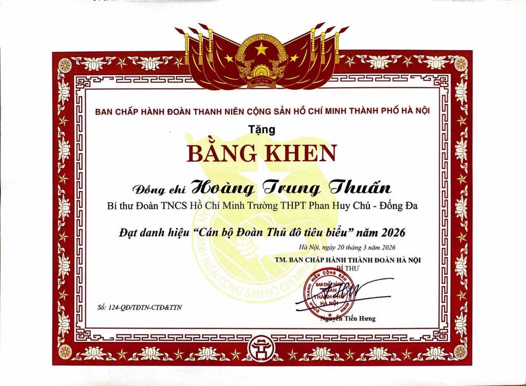 Nhân dịp kỷ niệm 95 năm Ngày thành lập Đoàn TNCS Hồ Chí Minh, Thành đoàn Hà Nội đã tổ chức tuyên dương, vinh danh những cán bộ Đoàn tiêu biểu của Thủ đô. Trường THPT Phan Huy Chú – Đống Đa vinh dự và tự hào chúc mừng thầy giáo Hoàng Trung Thuấn – Bí thư Đoàn trường đã được trao tặng Bằng khen với danh hiệu “Cán bộ Đoàn Thủ đô tiêu biểu” năm 2026.
