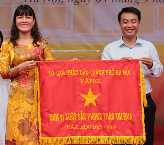 Cô giáo Hiệu trưởng Nguyễn Thị Nhiếp nhận cờ tặng Đơn vị xuất sắc của Ủy ban nhân dân thành phố Hà Nội