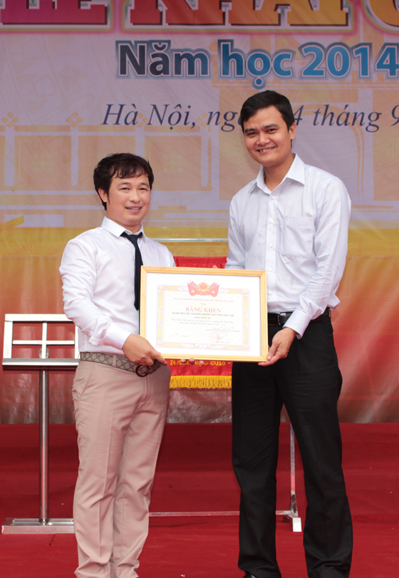 Thầy giáo Hoàng Trung Thuấn, cố vấn đoàn trường nhận bằng khen của đoàn cấp trên
