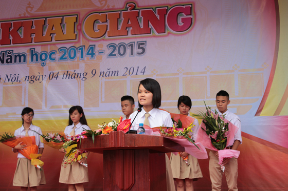 Học sinh Nguyễn Lan Hồng đại diện cho học sinh khối 10- K18 mới vào trường phát biểu và xin hứa quyết tâm học tập tốt.
