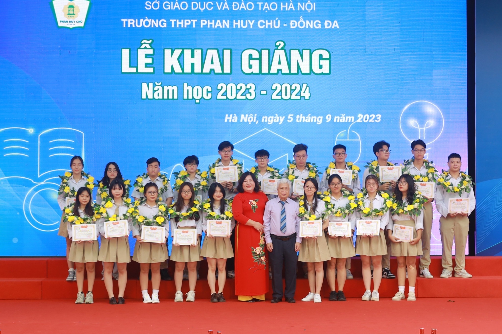 Thầy giáo Hiệu trưởng đầu tiên Đặng Ngọc Yên, cùng cô Hiệu trưởng Cao Thanh Nga trao vòng nguyệt quế cho các trò đạt điểm cao nhất trong kỳ thi TN THPT và động viên các em lớp 10 đạt điểm học bổng khi về với mái nhà lớn THPT Phan Huy Chú – Đống Đa.