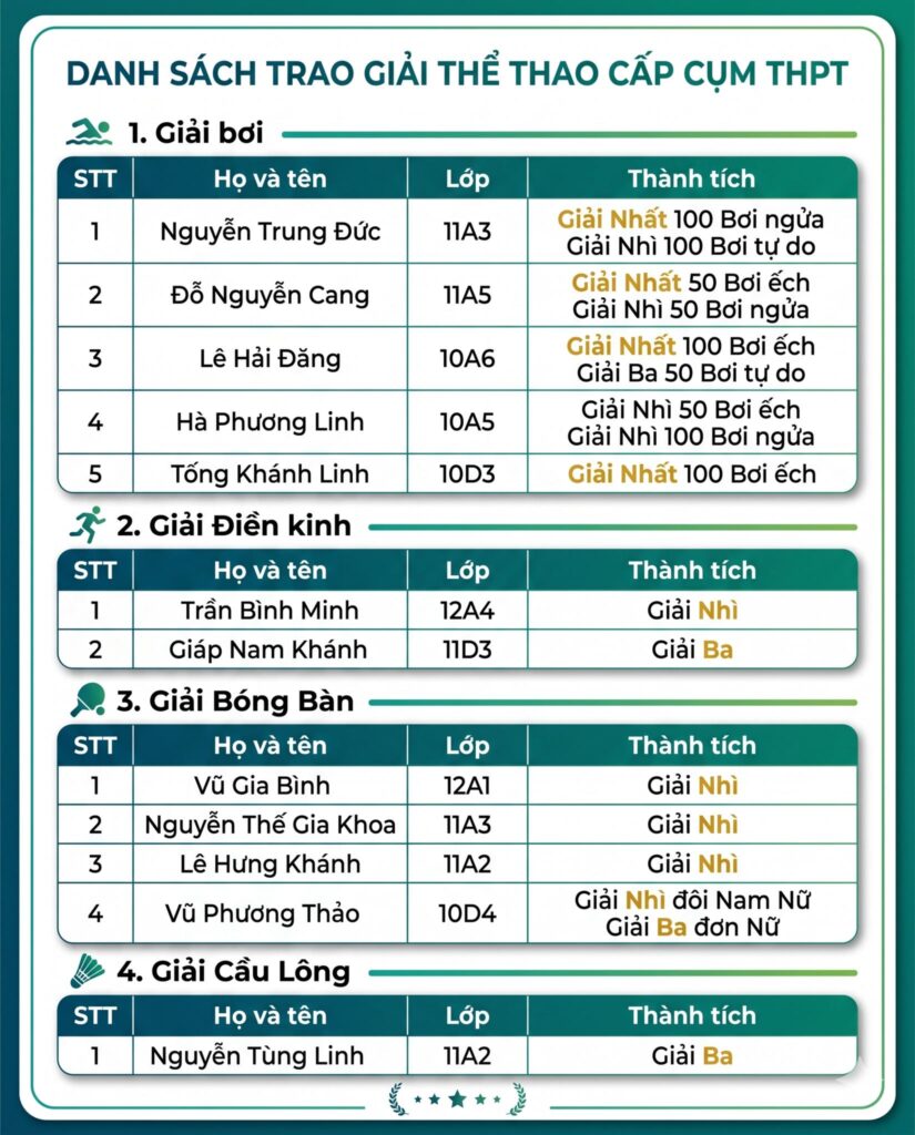 Ở nội dung thi đấu cấp Cụm THPT, các vận động viên của nhà trường đã ghi dấu ấn mạnh mẽ, đặc biệt ở bộ môn bơi lội. Bạn Nguyễn Trung Đức (11A3) xuất sắc giành Giải Nhất 100m bơi ngửa và Giải Nhì 100m bơi tự do. Bạn Đỗ Nguyễn Cang (11A5) đạt Giải Nhất 50m bơi ếch và Giải Nhì 50m bơi ngửa. Bạn Lê Hải Đăng (10A6) giành Giải Nhất 100m bơi ếch và Giải Ba 50m bơi tự do. Bạn Hà Phương Linh (10A5) đạt Giải Nhì 50m bơi ếch và Giải Nhì 100m bơi ngửa, trong khi bạn Tống Khánh Linh (10D3) xuất sắc giành Giải Nhất 100m bơi ếch.