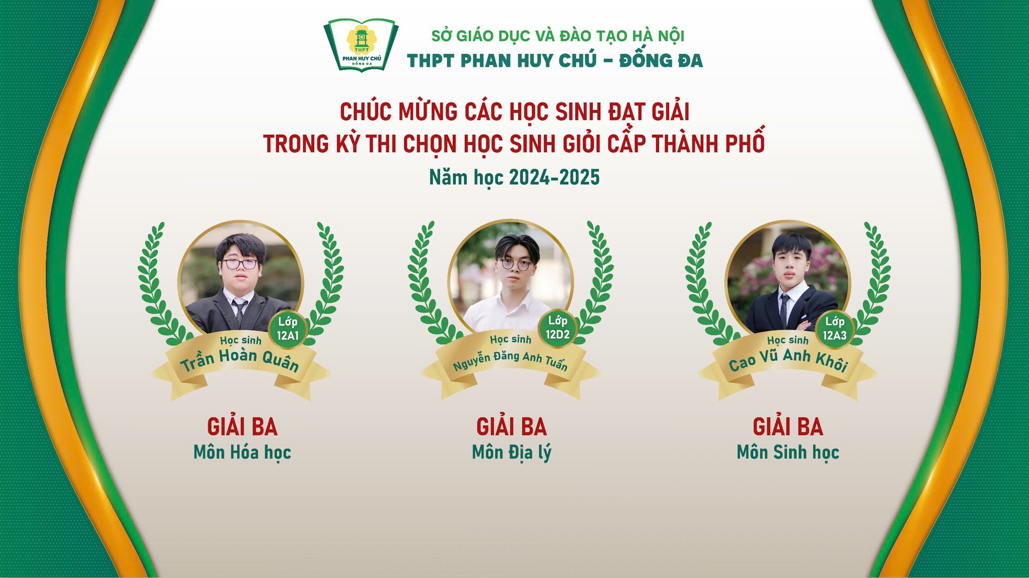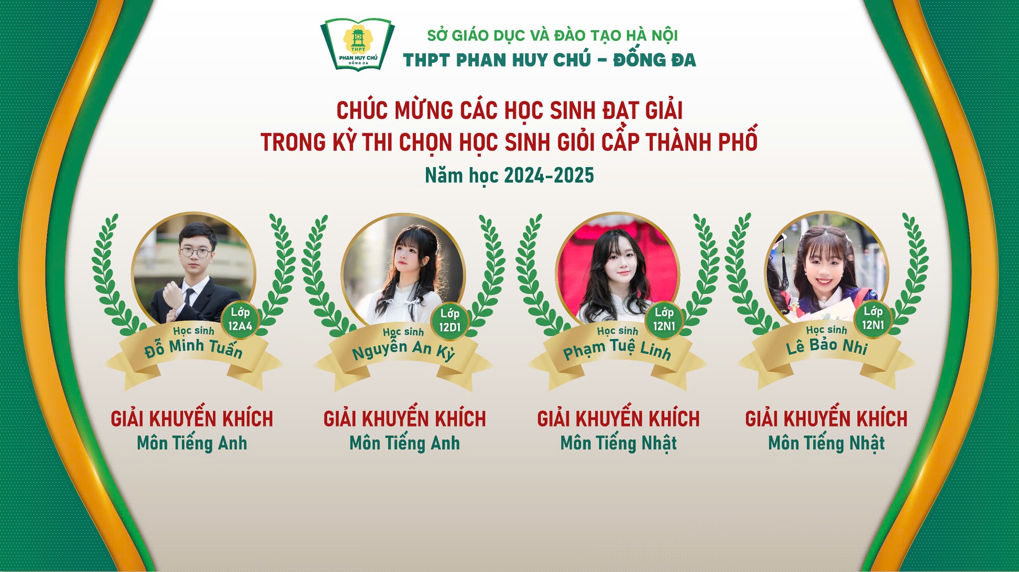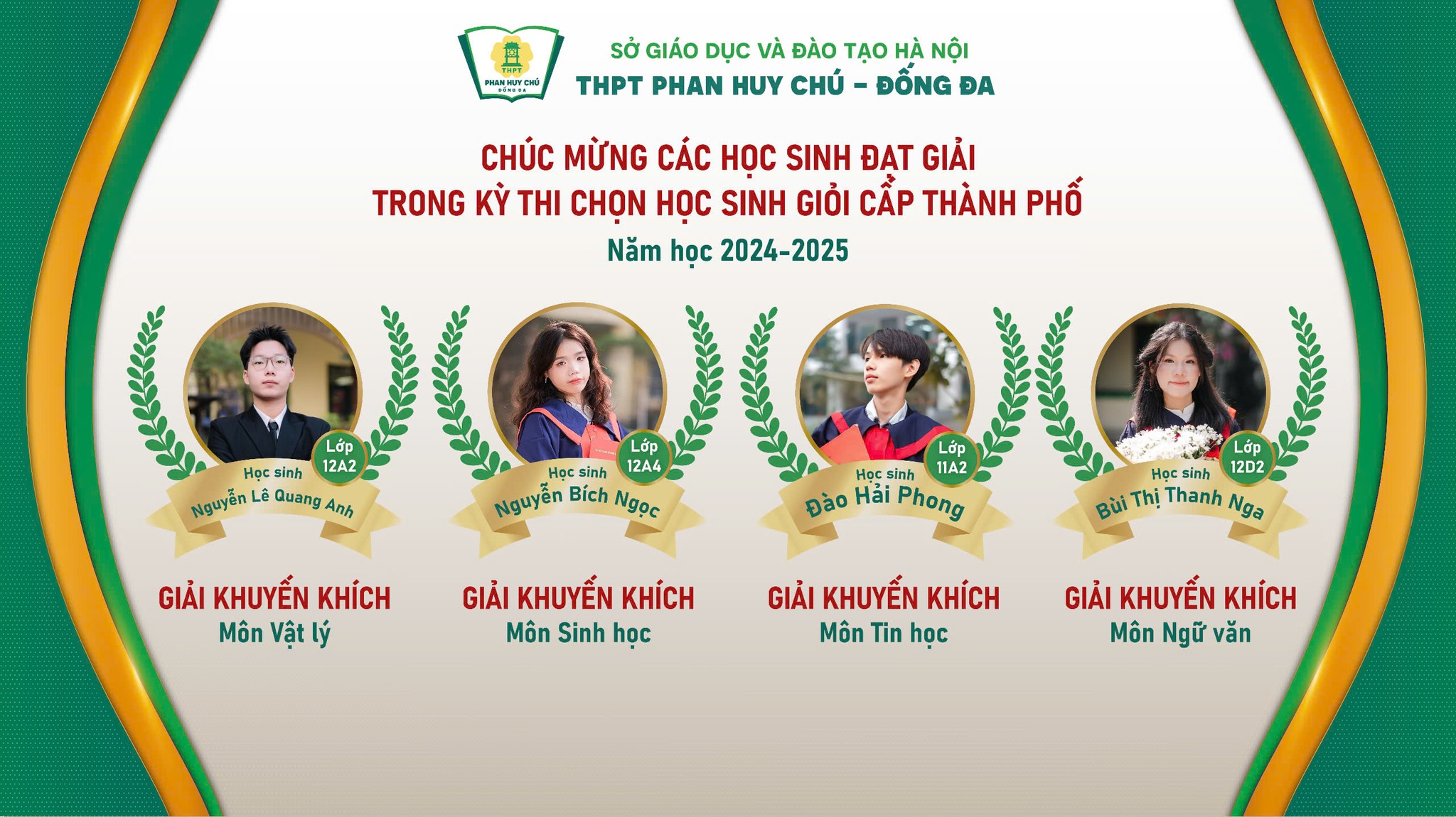 Năm học 2024-2025, các bạn học sinh của trường THPT Phan Huy Chú - Đống Đa tham gia kỳ thi chọn học sinh giỏi các môn văn hóa toàn thành phố Hà Nội với nhiều cố gắng. Mới đây, Sở Giáo dục và Đào tạo Hà Nội đã chính thức công bố kết quả xếp giải. Chúc mừng đội tuyển học sinh giỏi các môn của nhà trường vì đã đạt được những thành tích xứng đáng.